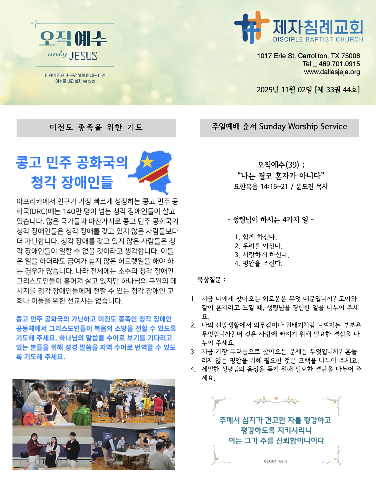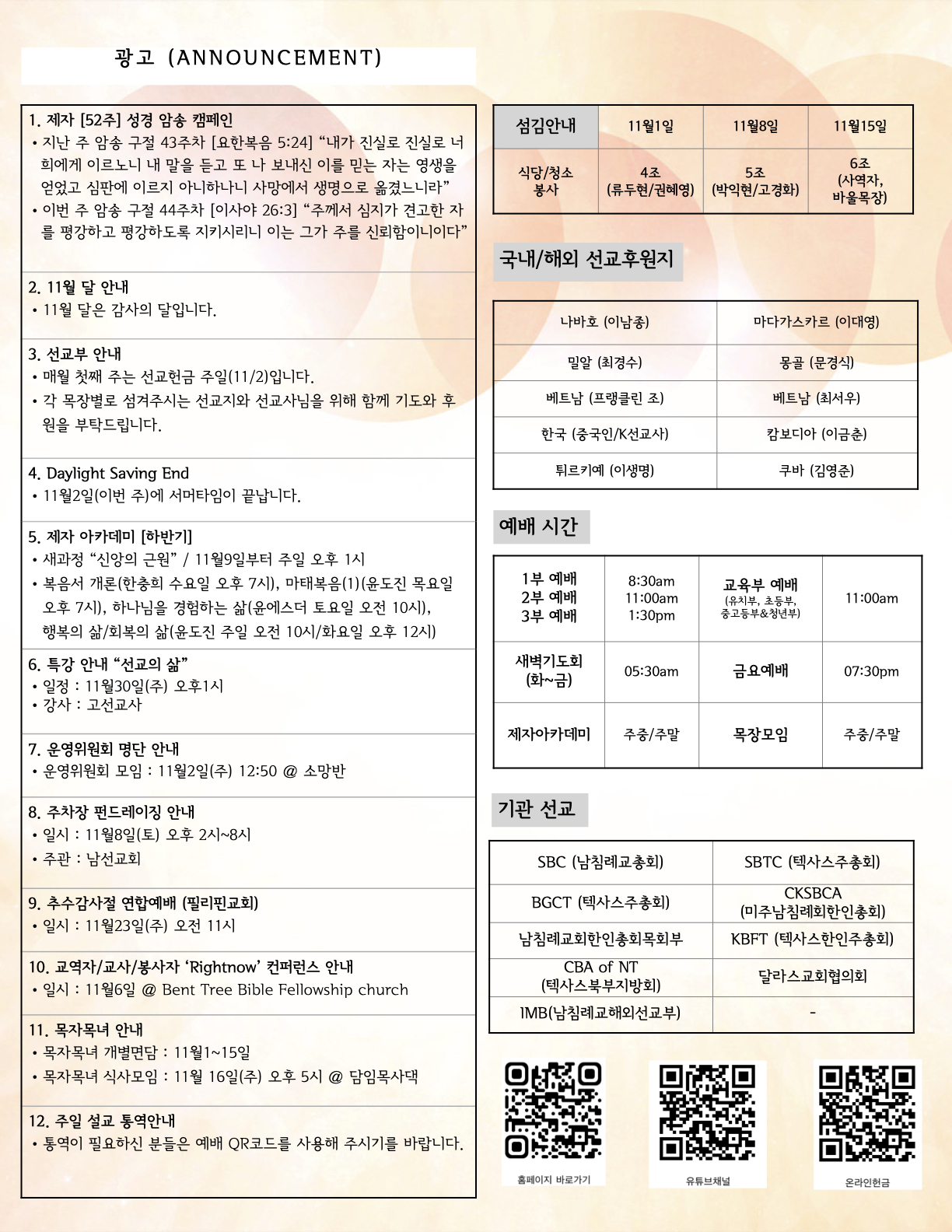 (2025.11.02) 주일 주보 페이지 정보 작성자 달라스제자침례교회 댓글 0건 조회 47회 작성일 25-11-15 17:29 목록 본문 - 이전글(2025.11.09) 주일 주보 25.11.15 다음글(2025.10.26) 주일 주보 25.10.25