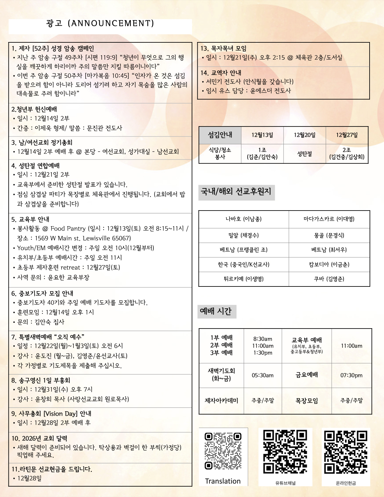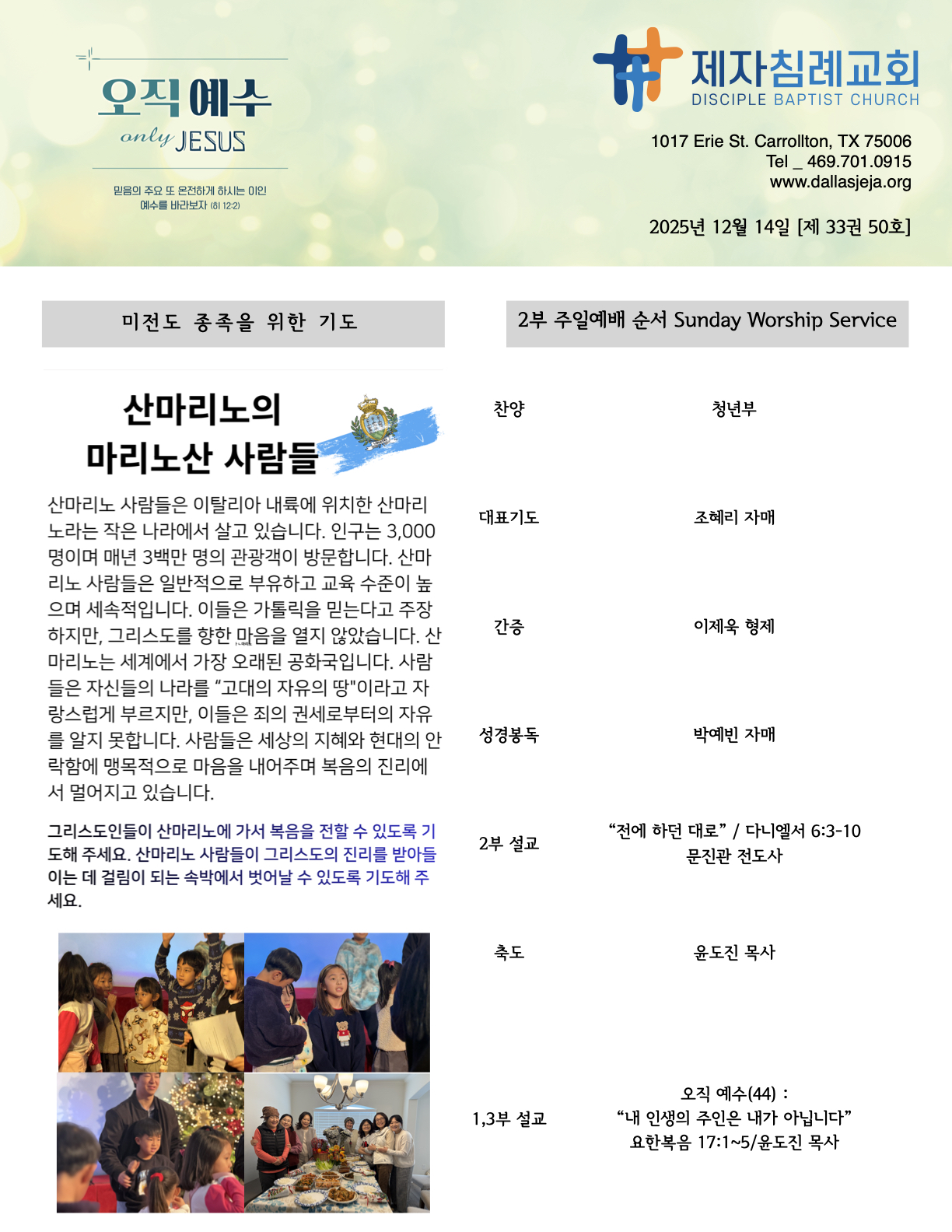 (2025.12.07) 주일 주보 페이지 정보 작성자 달라스제자침례교회 댓글 0건 조회 6회 작성일 25-12-13 15:18 목록 본문 - 다음글(2025.12.07) 주일 주보 25.12.06