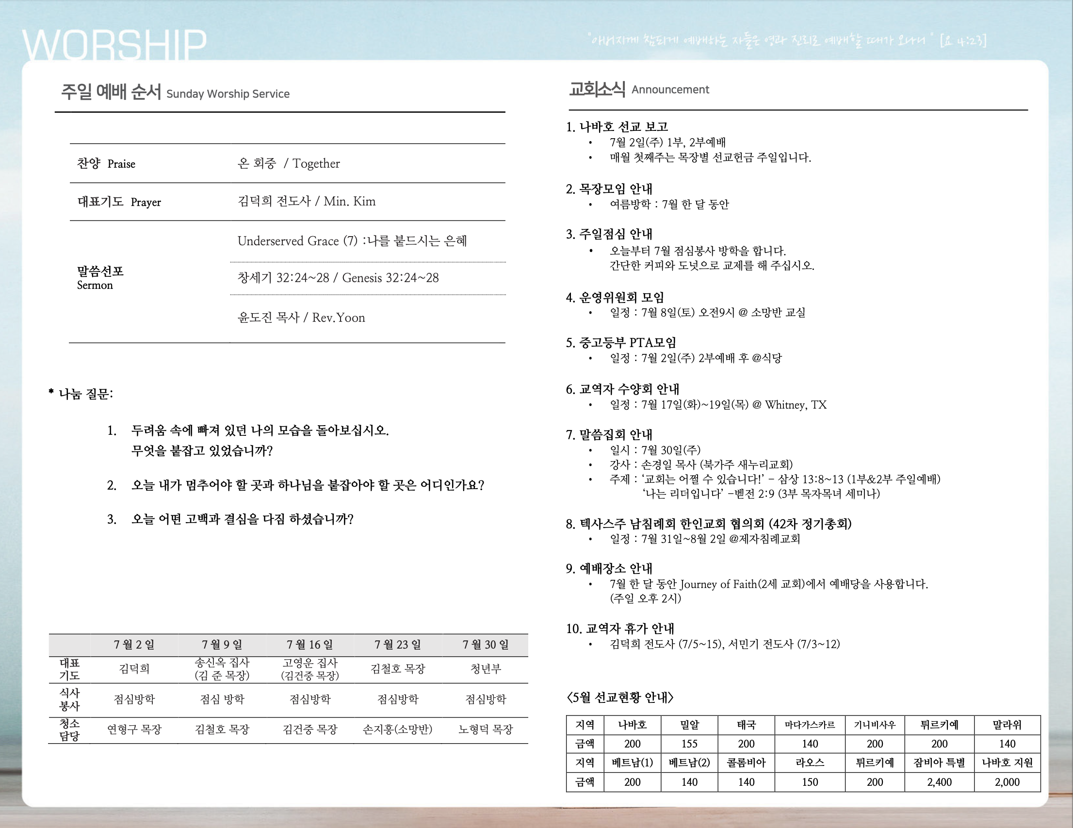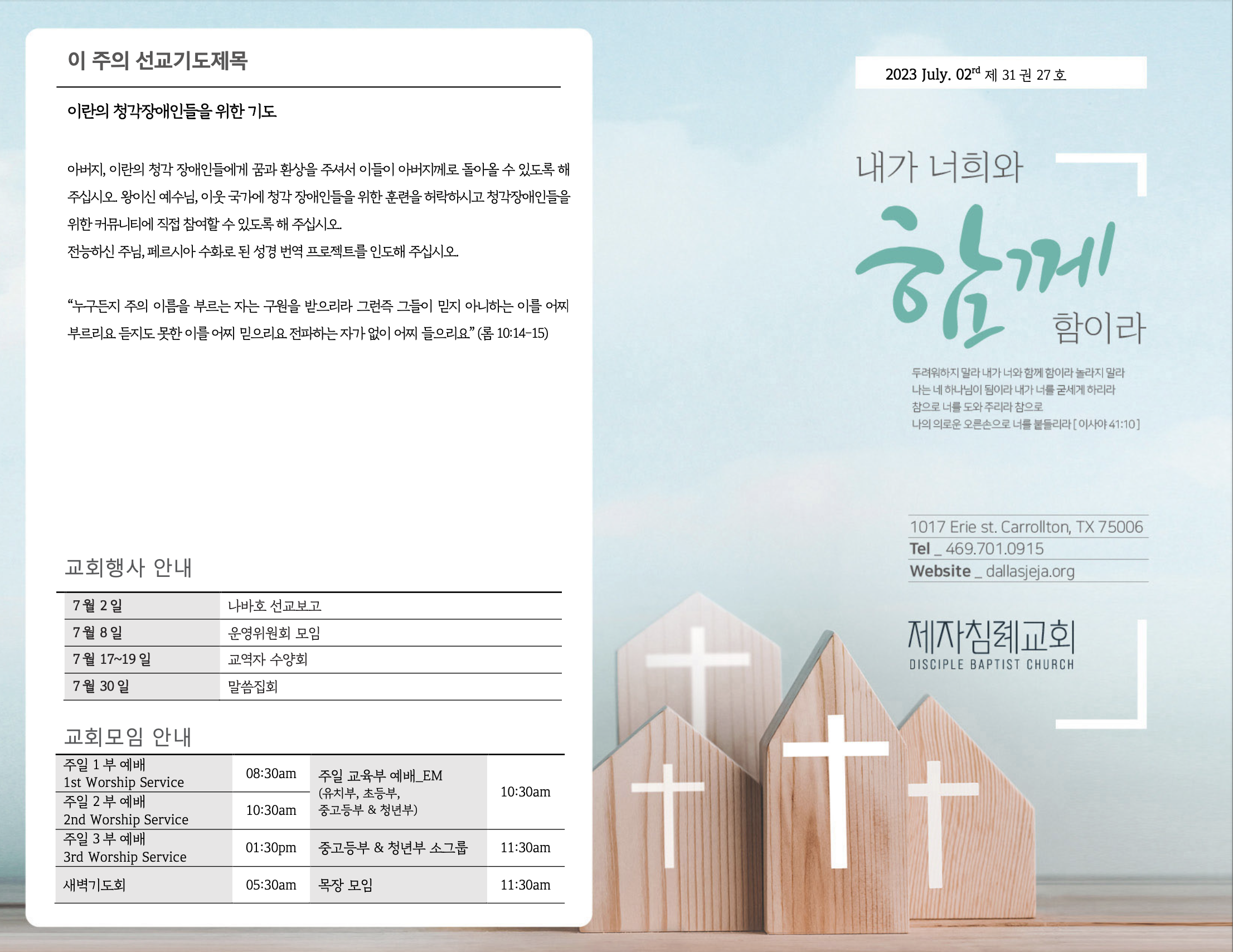 (2023.07.02) 주일예배 주보 페이지 정보 작성자 달라스제자침례교회 댓글 0건 조회 349회 작성일 23-07-01 13:27 목록 본문 - 이전글(2023.07.09) 주일예배 주보 23.07.08 다음글(2023.06.25) 주일예배 주보 23.06.24