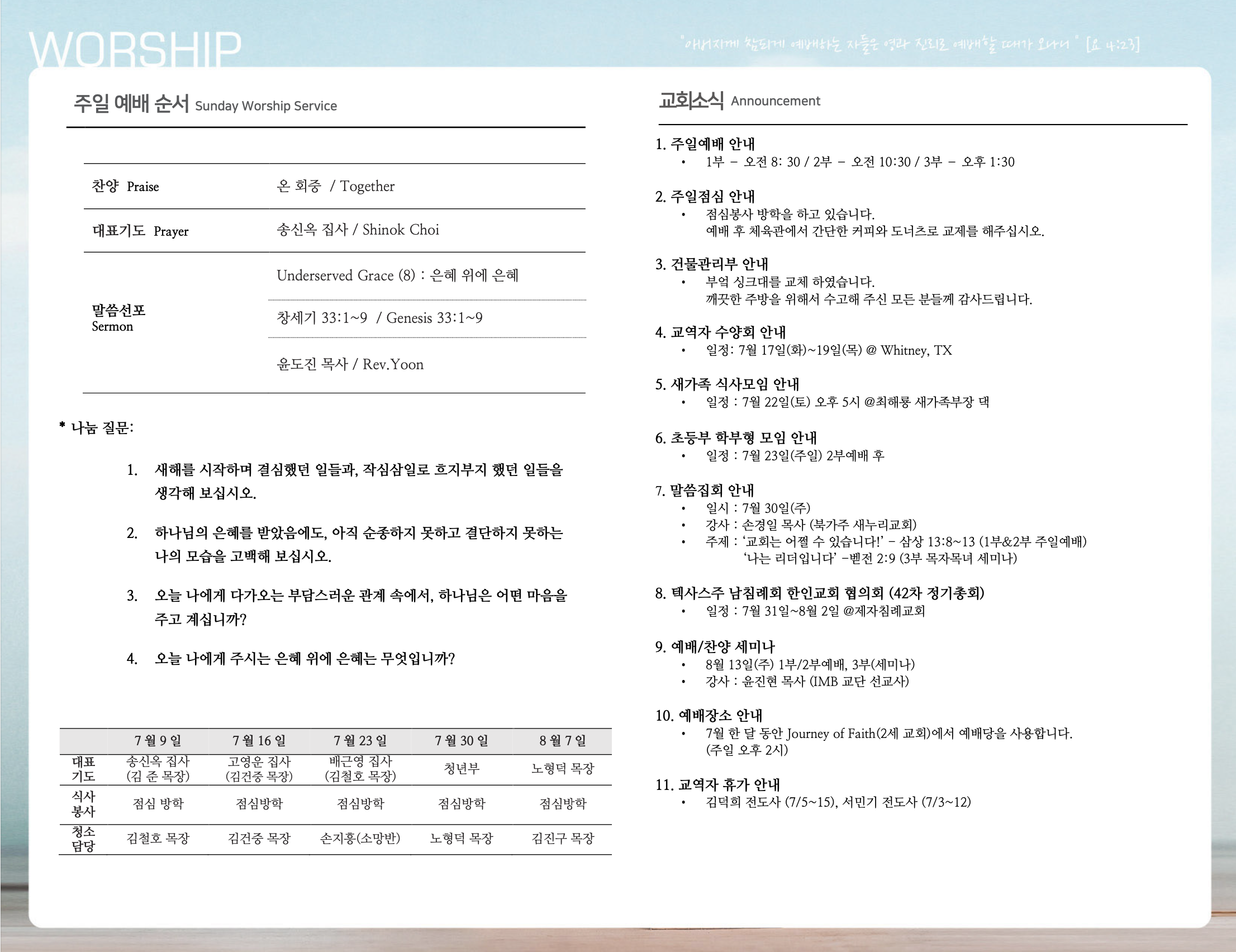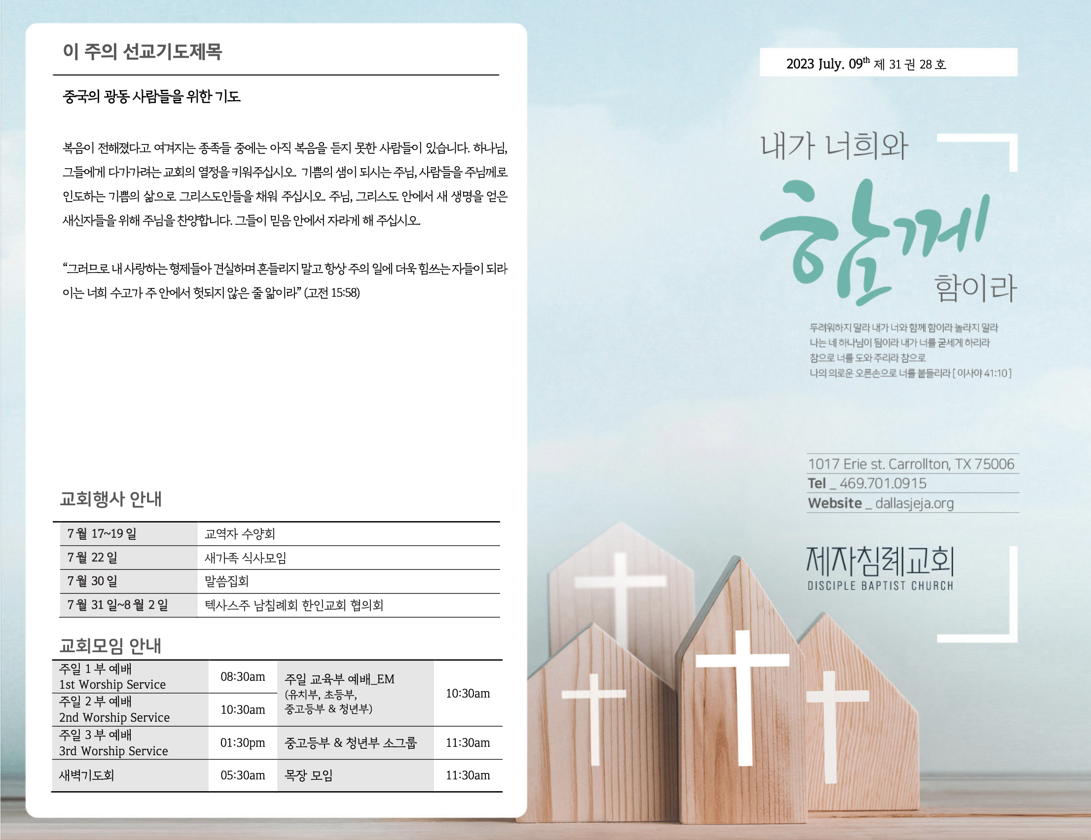 (2023.07.09) 주일예배 주보 페이지 정보 작성자 달라스제자침례교회 댓글 0건 조회 335회 작성일 23-07-08 10:29 목록 본문 - 이전글(2023.07.16) 주일예배 주보 23.07.15 다음글(2023.07.02) 주일예배 주보 23.07.01