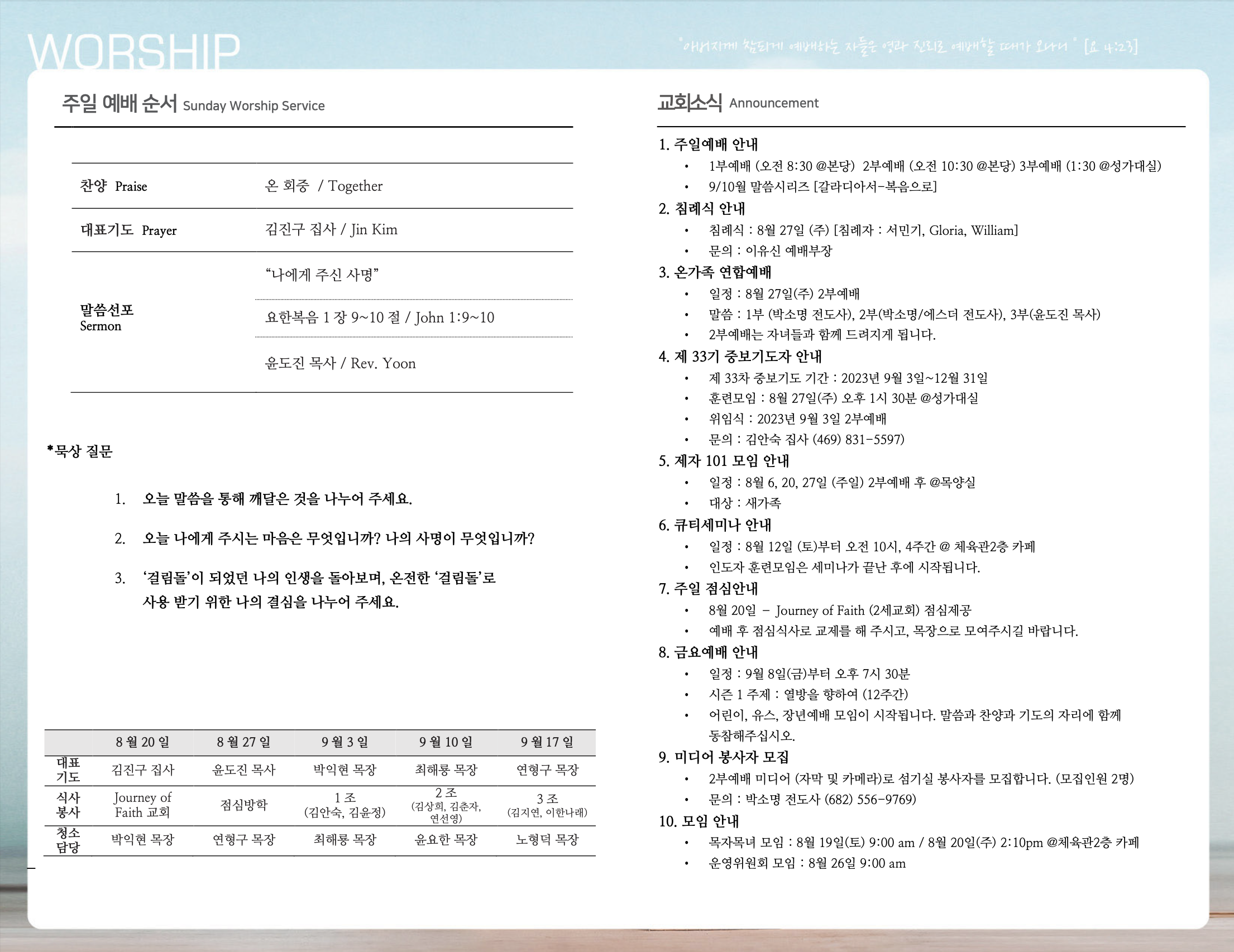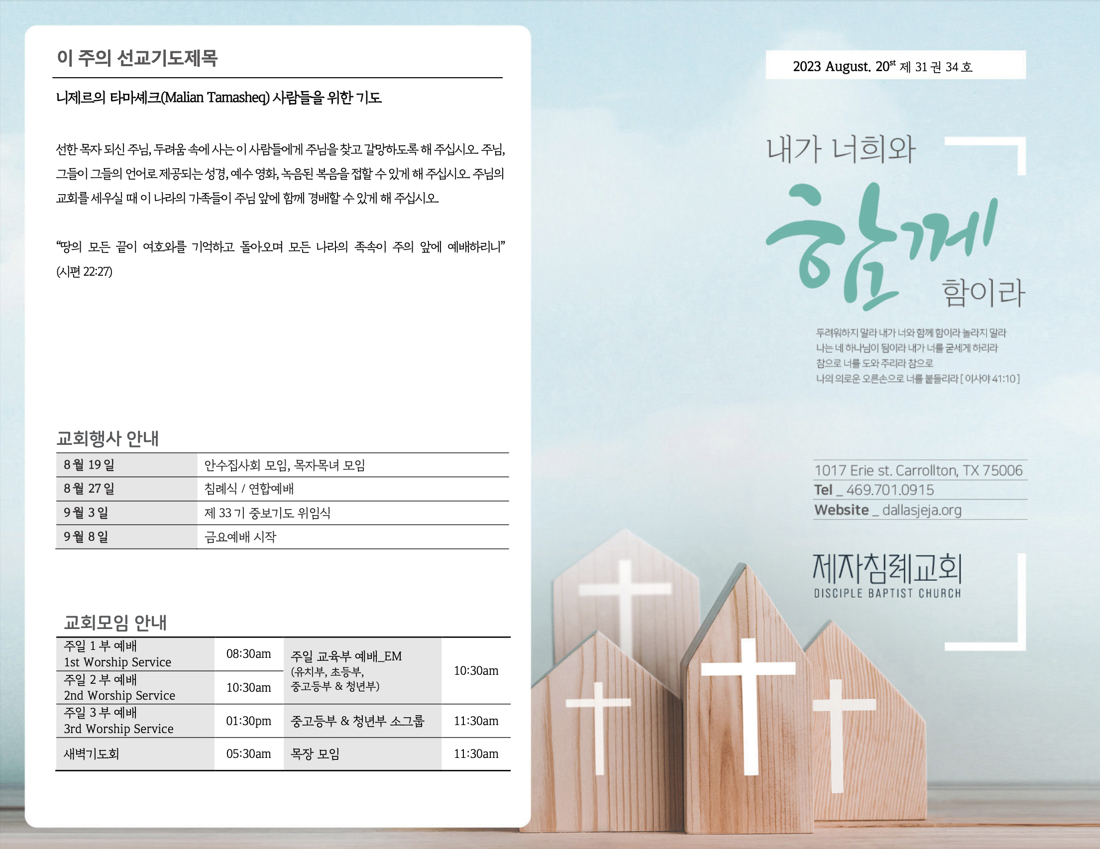 (2023.08.20) 주일예배 주보 페이지 정보 작성자 달라스제자침례교회 댓글 0건 조회 329회 작성일 23-08-19 11:00 목록 본문 - 이전글(2023.08.27) 주일예배 주보 23.08.26 다음글(2023.08.13) 주일예배 주보 23.08.12