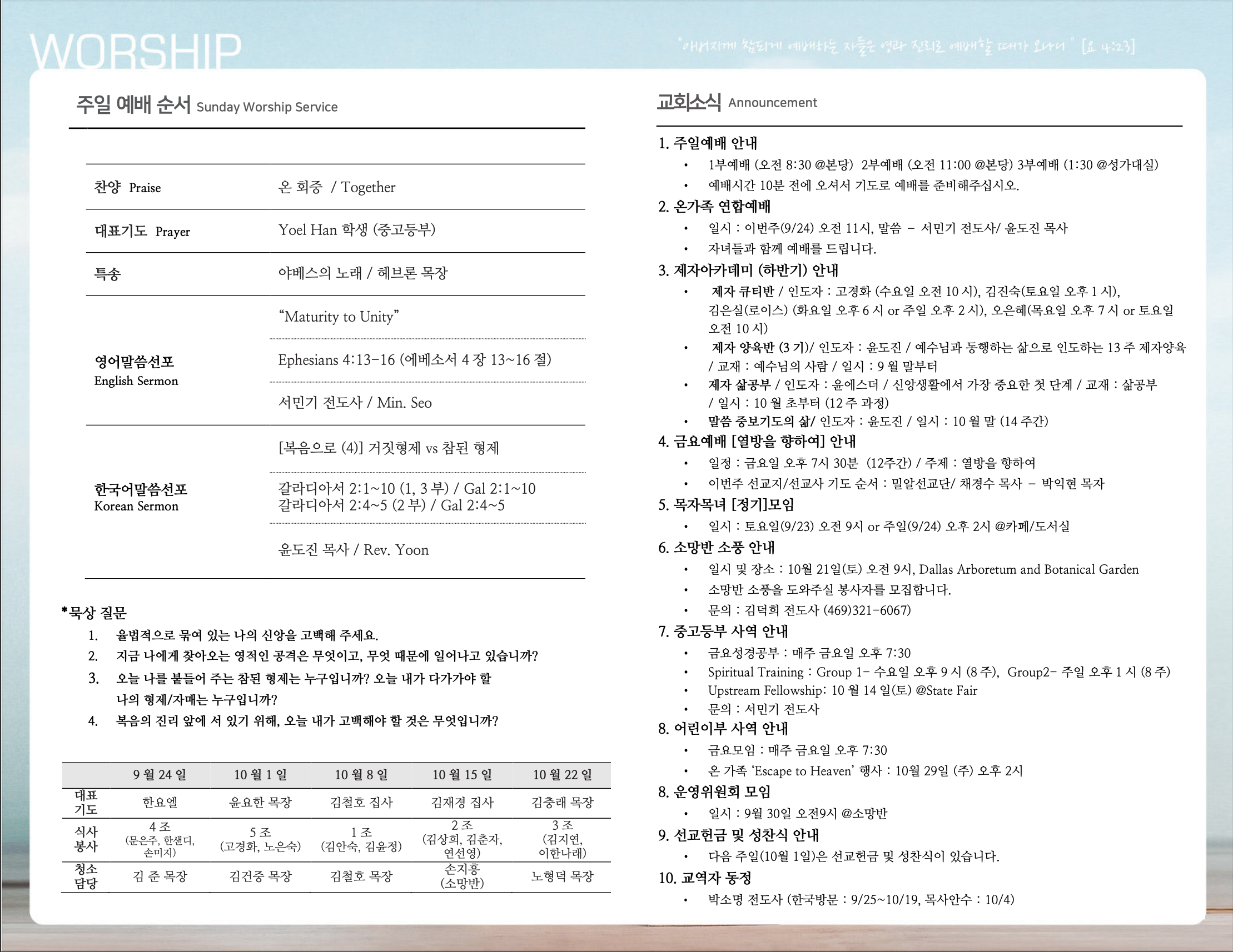 (2023.09.24) 주일예배 주보 페이지 정보 작성자 달라스제자침례교회 댓글 0건 조회 368회 작성일 23-09-23 09:52 목록 본문 - 이전글(2023.10.01) 주일예배 주보 23.09.30 다음글(2023.09.17) 주일예배 주보 23.09.16