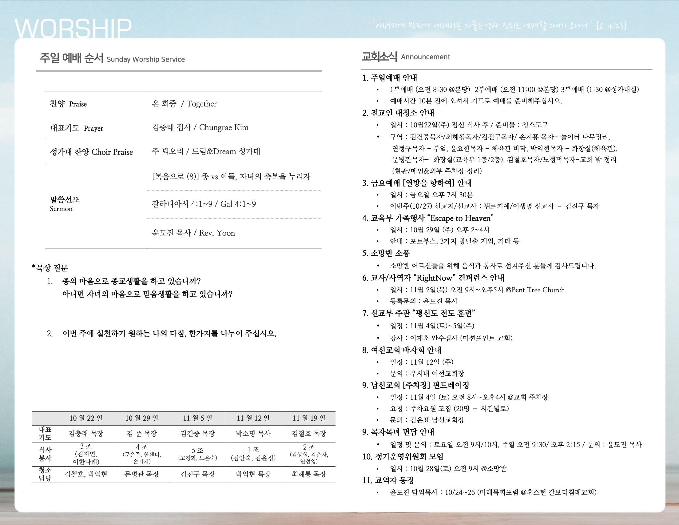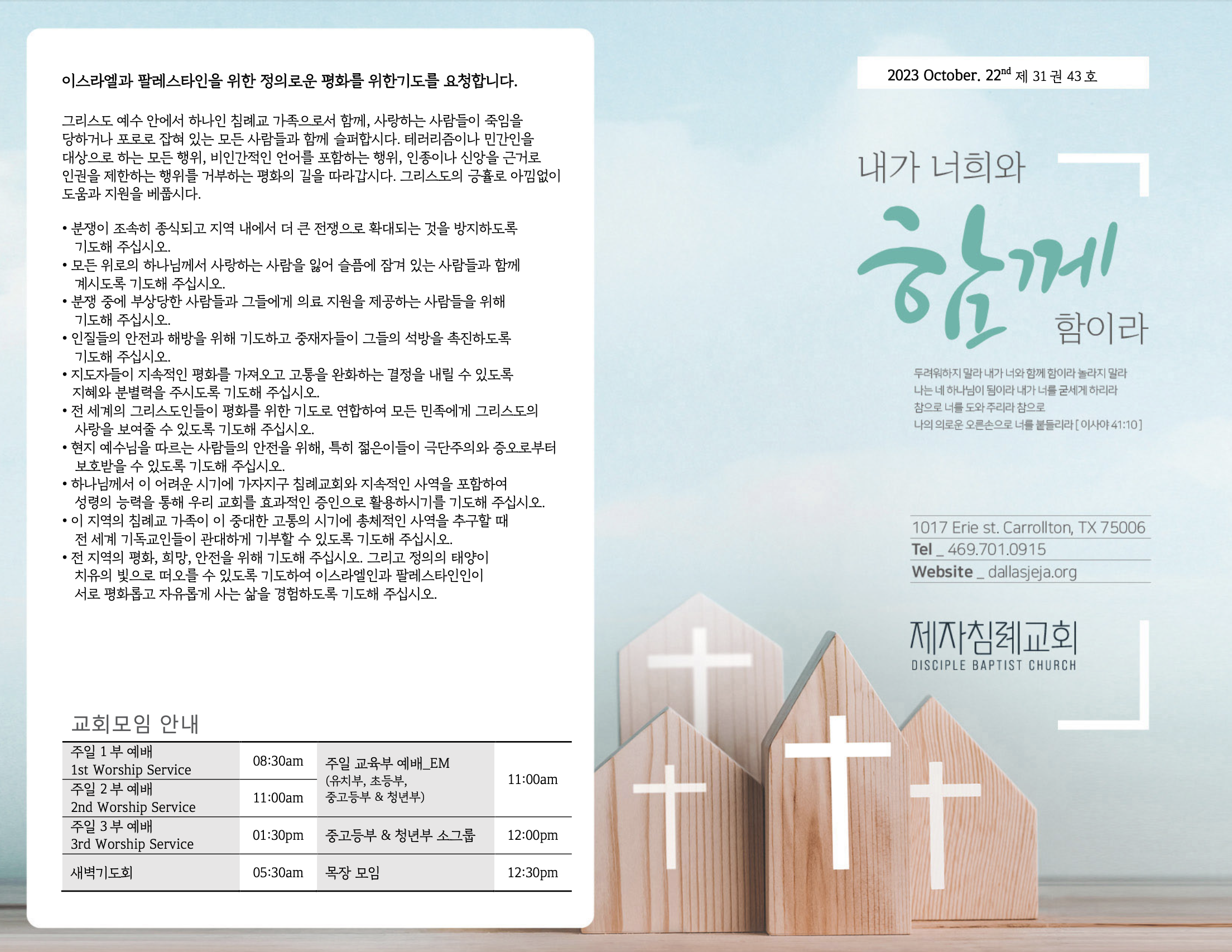 (2023.10.22) 주일예배 주보 페이지 정보 작성자 달라스제자침례교회 댓글 0건 조회 324회 작성일 23-10-21 19:58 목록 본문 - 이전글(2023.10.29) 주일예배 주보 23.10.28 다음글(2023.10.15) 주일예배 주보 23.10.14