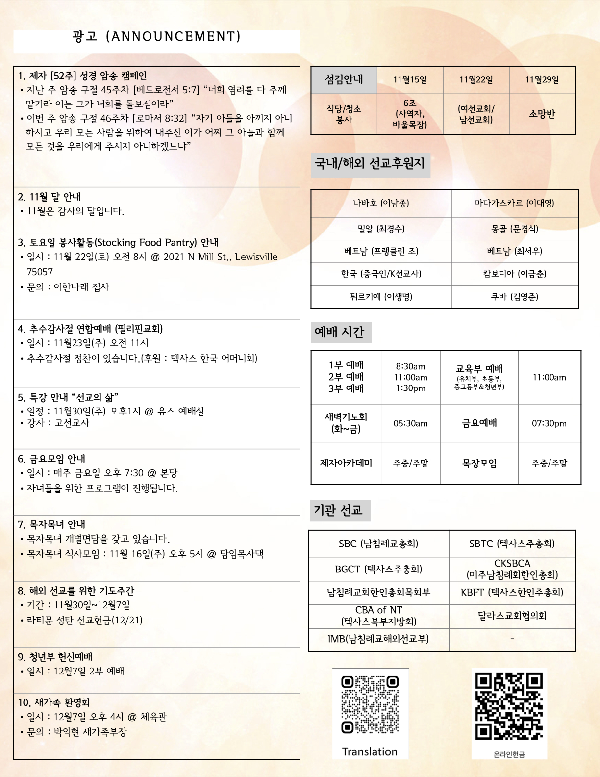 (2025.11.16) 주일 주보 페이지 정보 작성자 달라스제자침례교회 댓글 0건 조회 34회 작성일 25-11-15 17:30 목록 본문 - 이전글(2025.11.23) 주일 주보 25.11.22 다음글(2025.11.09) 주일 주보 25.11.15