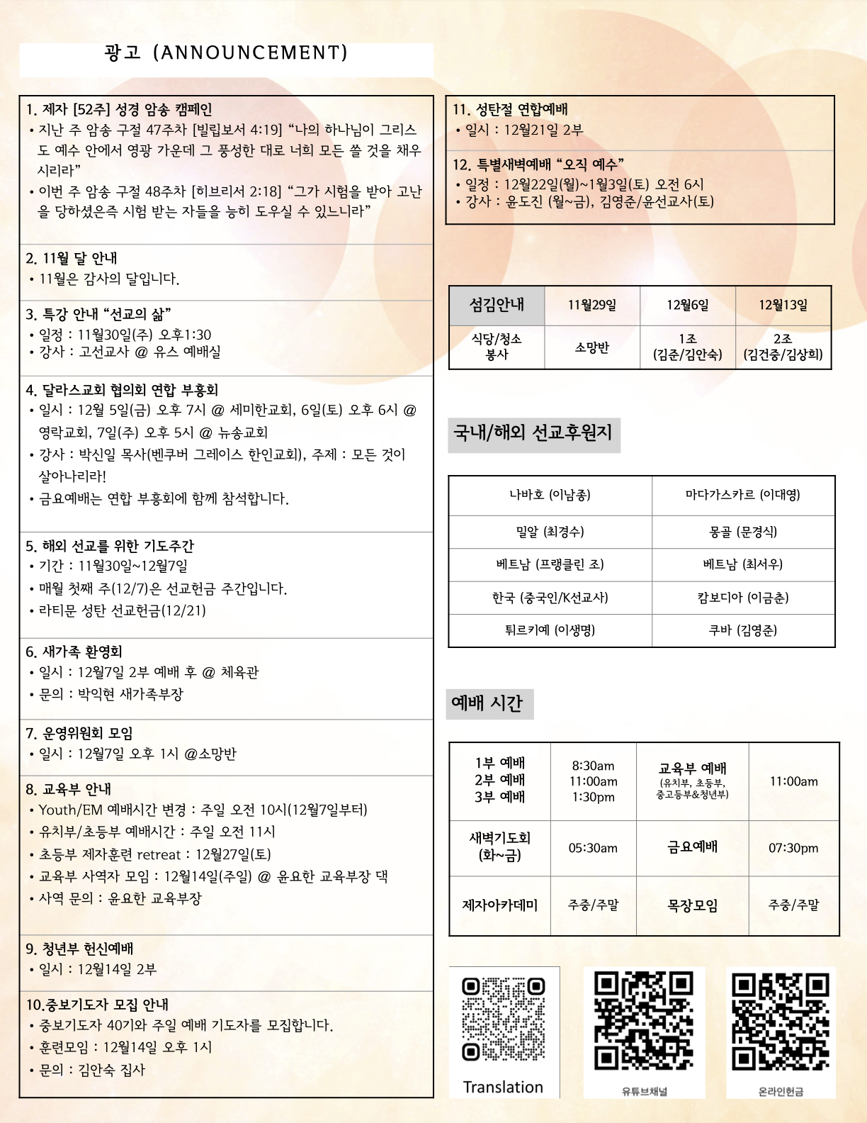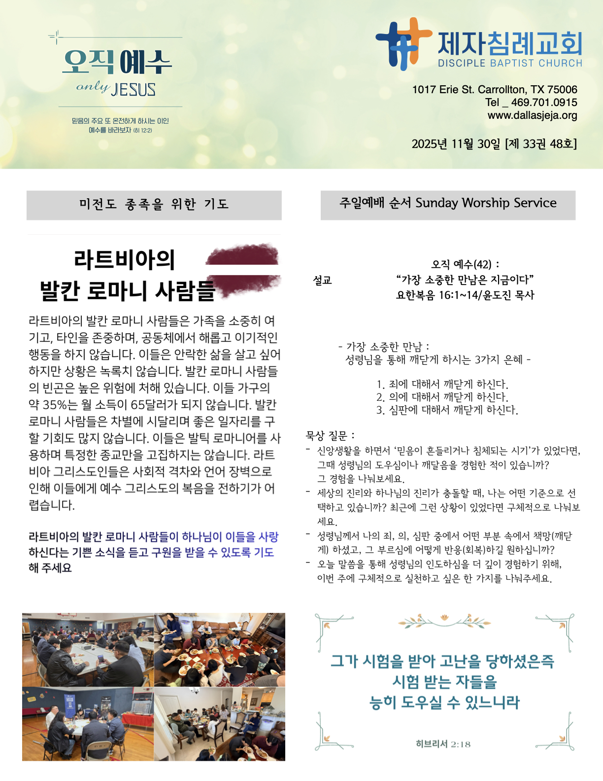 (2025.11.30) 주일 주보 페이지 정보 작성자 달라스제자침례교회 댓글 0건 조회 18회 작성일 25-11-29 11:33 목록 본문 - 다음글(2025.11.23) 주일 주보 25.11.22