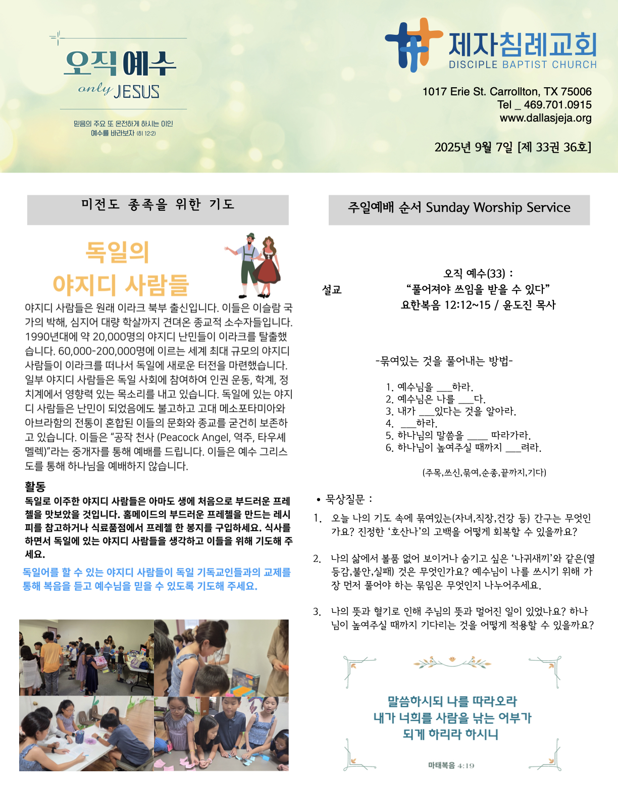 (2025.09.07) 주일 주보 페이지 정보 작성자 달라스제자침례교회 댓글 0건 조회 73회 작성일 25-09-06 13:05 목록 본문 - 이전글(2025.09.14) 주일 주보 25.09.13 다음글(2025.08.31) 주일 주보 25.08.30